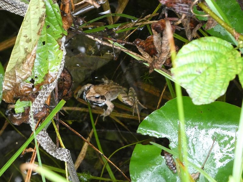 【トピックニュース記事89】~地域の両生類の特徴~ トピックニュース X Facebook はてブ Pocket LINE コピー 2025.09.18 天気:雨 気温22.0℃ 、水温18℃、湿度90% (午前8時10分) 令和7年9月18日(木)に新潟県妙高市の国立公園内の施設のビオトープ池でヤマアカガエルを観察しました。近くにあった蛇の脱皮殻を池の中から見つめていました。 佐藤直樹